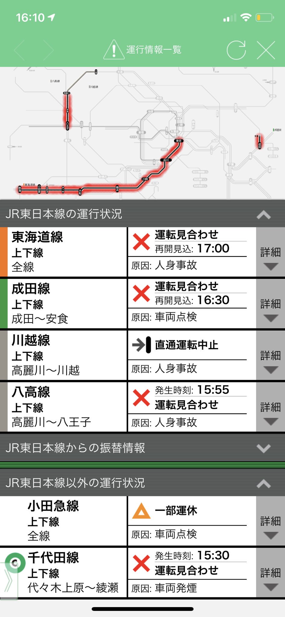 現在 平常どおり運転しています 09月09日 19時30分 一部列車遅延 17時55分頃 jr常磐線各駅停車 綾瀬駅で車両点検のため 一部の列車に遅れが出ています. 順調を隠す 関東エリア 東京エリア 大雨 強風 運転再開 人身事故 混雑 振替輸送 車両点検 本日 東京メトロ千代田線 の運行状況クチコミ投稿はありません. 直通運転中止 20時35分頃 東武スカイツリーライン 新田駅で人身事故のため thliner7 9号の運転 東武スカイツリーラインとの直通運転を中止しています 09月03日 20時52分 直通運転中止.
